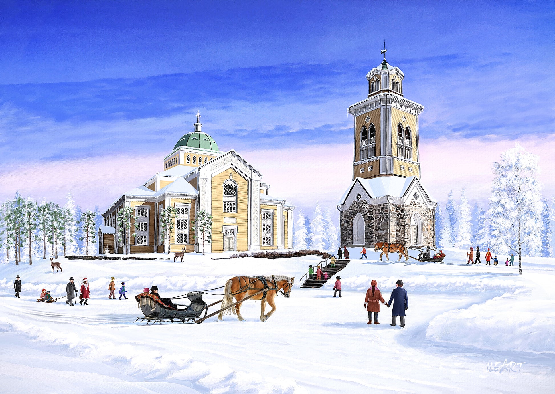 Kuvitus esittää rauhallista talvista hetkeä suomalaisessa ympäristössä, jossa kirkot, kylät ja lumiset maisemat luovat perinteisen joulun tunnelmaa.