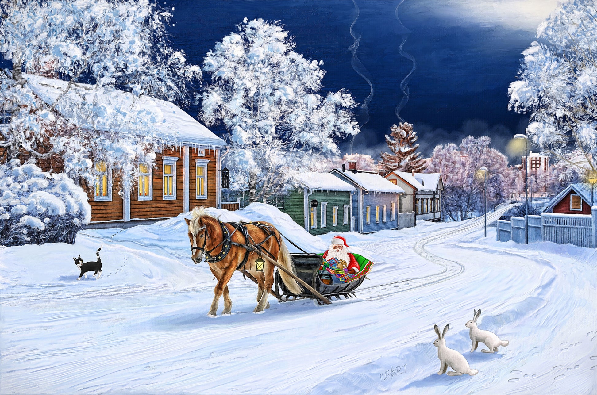 Tunnelmallinen joulukortti Oulun talvisesta maisemasta.