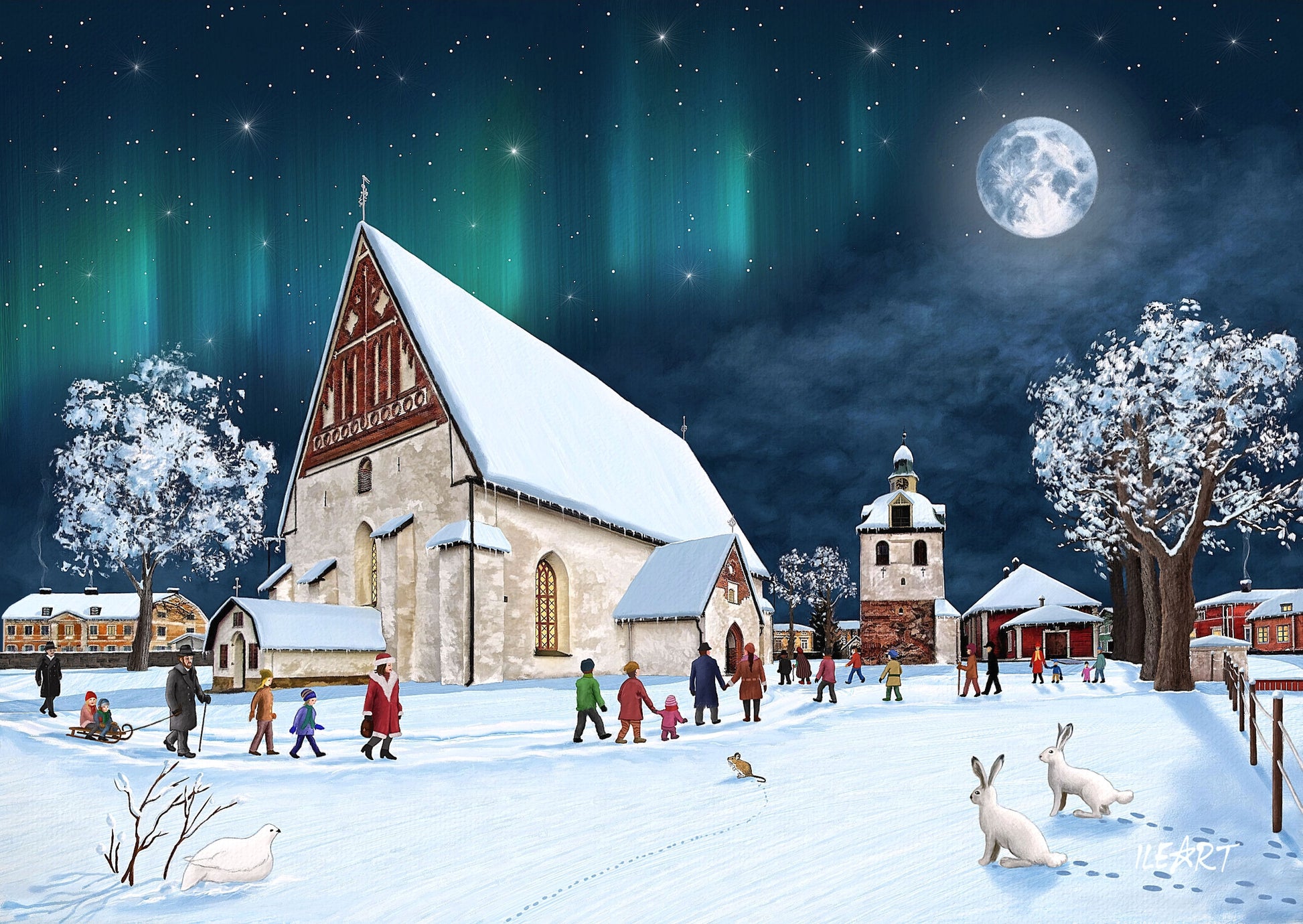 Kuvitus esittää rauhallista talvista hetkeä suomalaisessa ympäristössä, jossa kirkot, kylät ja lumiset maisemat luovat perinteisen joulun tunnelmaa.