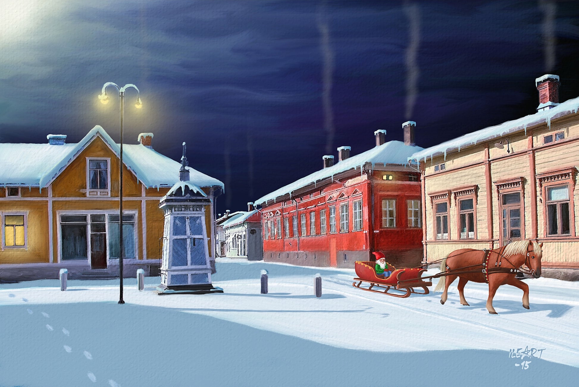 Tunnelmallinen joulukortti Rauman talvisesta maisemasta.
