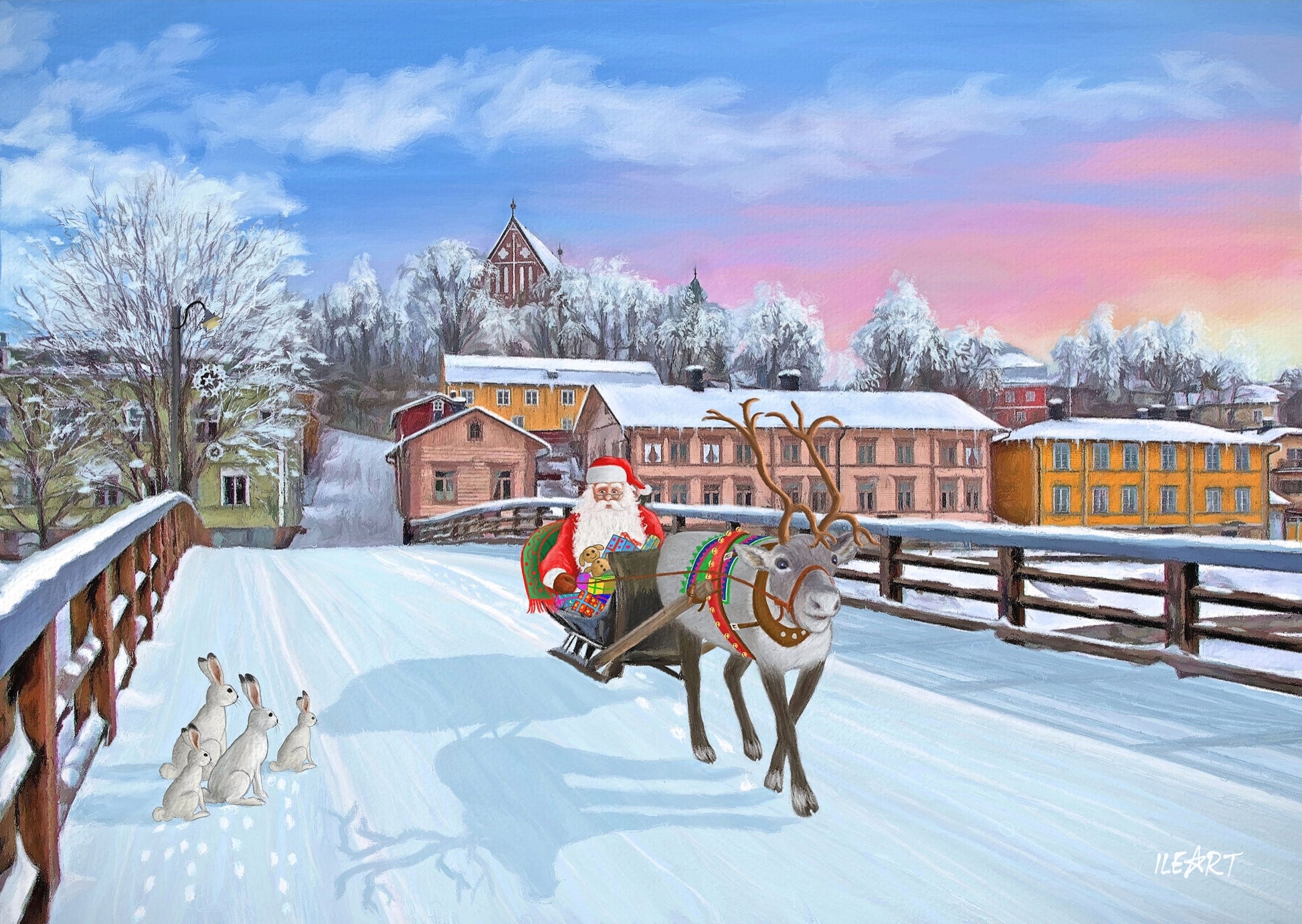Tunnelmallinen joulukortti Porvoon talvisesta maisemasta.
